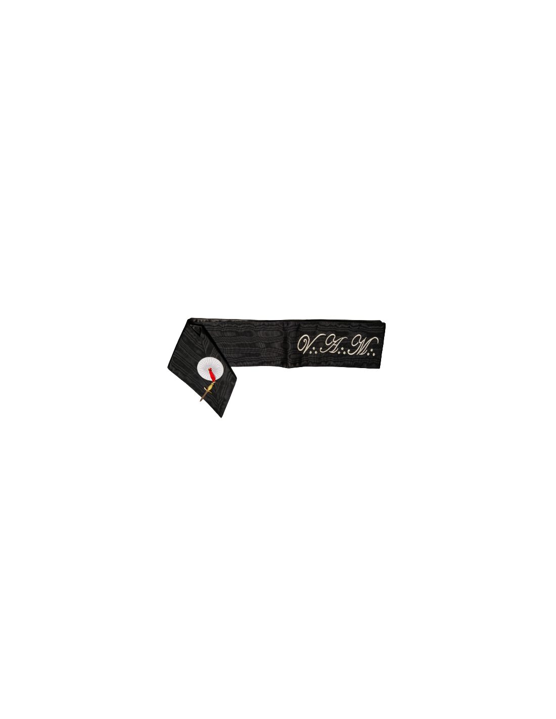 BAUDRIER 1ER ORDRE RITEFRANÇAIS NON RÉVERSIBLE EN RUBAN MOIRÉ NOIR AVEC COCARDE BLANCHE ET ROUGE SYMBOLES V A M BRODÉ AU FIL D'OR ET AU FIL DE SOIE SUR LE DEVANT - DOS NOIR ATTACHE POUR BIJOUX DIM : LONG 90 CM X LARG 11 Conforme GCRF