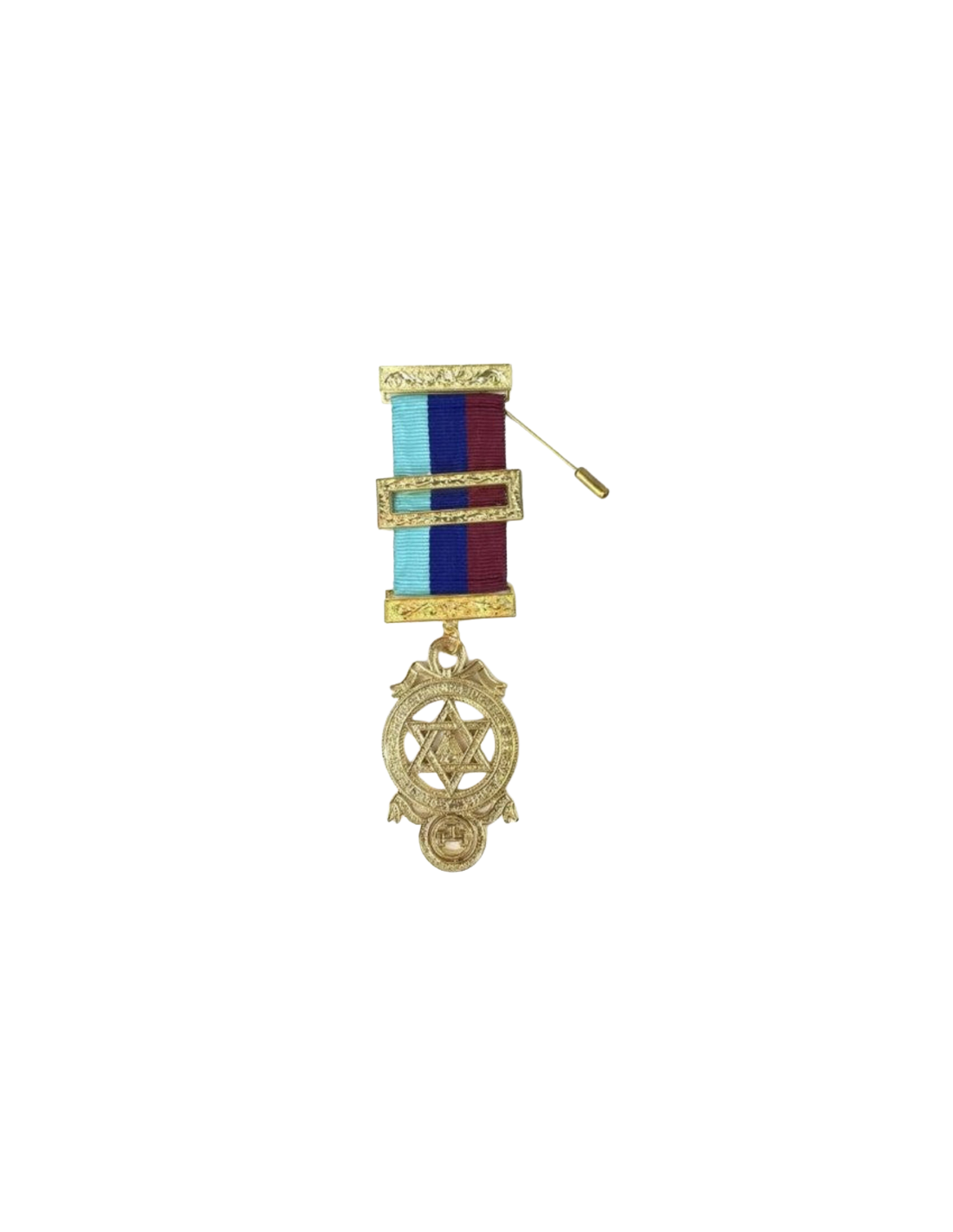 Le ruban de ce bijou de poitrine de Grand Officier de l'Arche Royale est décoré d’une barrette au milieu. Il présente aussi des décors dorés à ses extrémités. Sur sa partie inférieure, ce bijou de poitrine arbore un médaillon doré qui représente une étoile de David inscrite dans un cercle. Ce bijou de poitrine de Grand Officier de l’Arche Royale est disponible en taille S et L. Le médaillon présente un diamètre de 2,5 cm pour la taille S contre 3,5 cm pour la taille L.