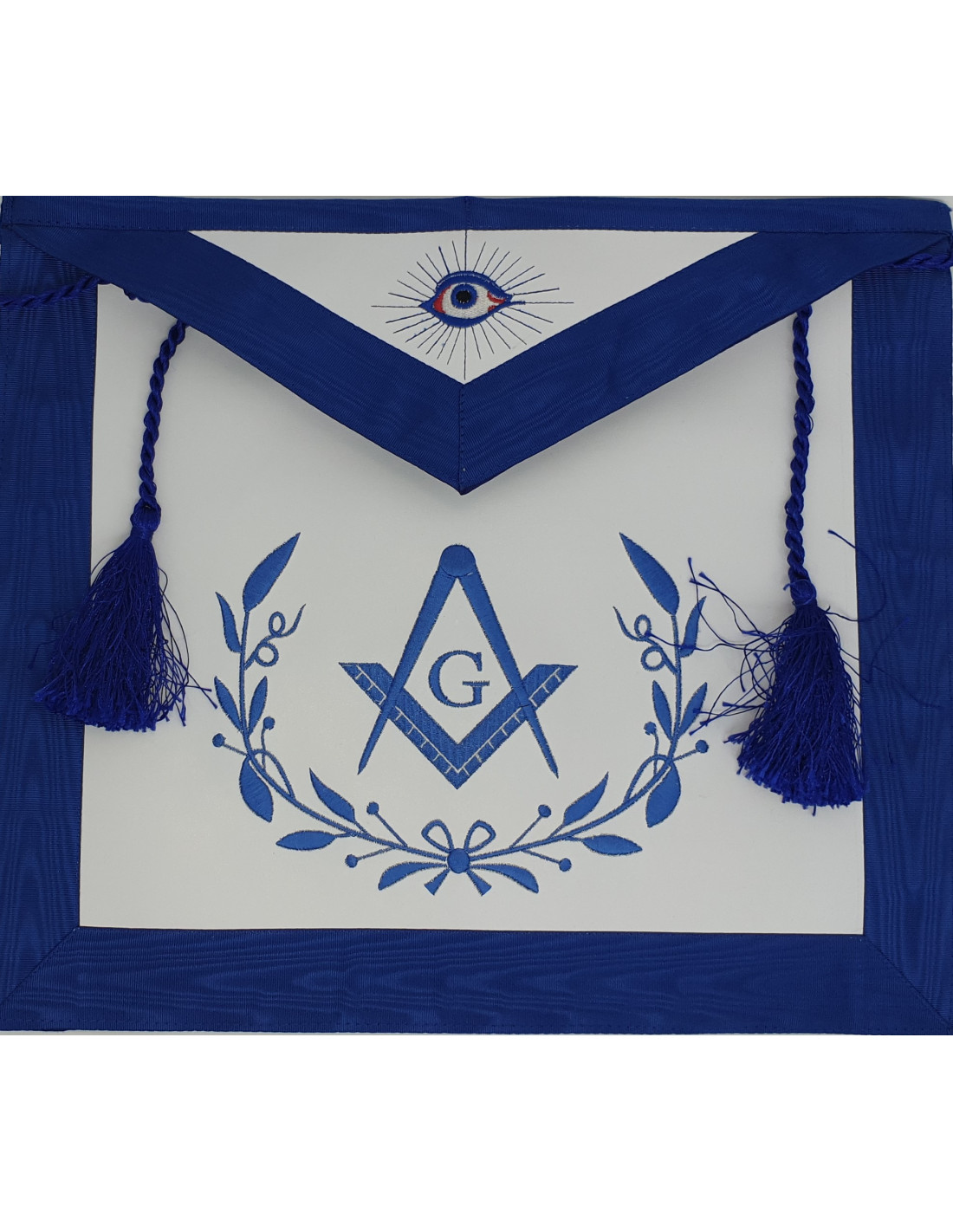 Ce tablier Maître RY (Rite York) est bordé d’un ruban moiré bleu royal qui le rend remarquable. Le devant du tablier met en avant de jolies broderies représentant des symboles maçonniques classiques tels que le compas et l’œil flamboyant.