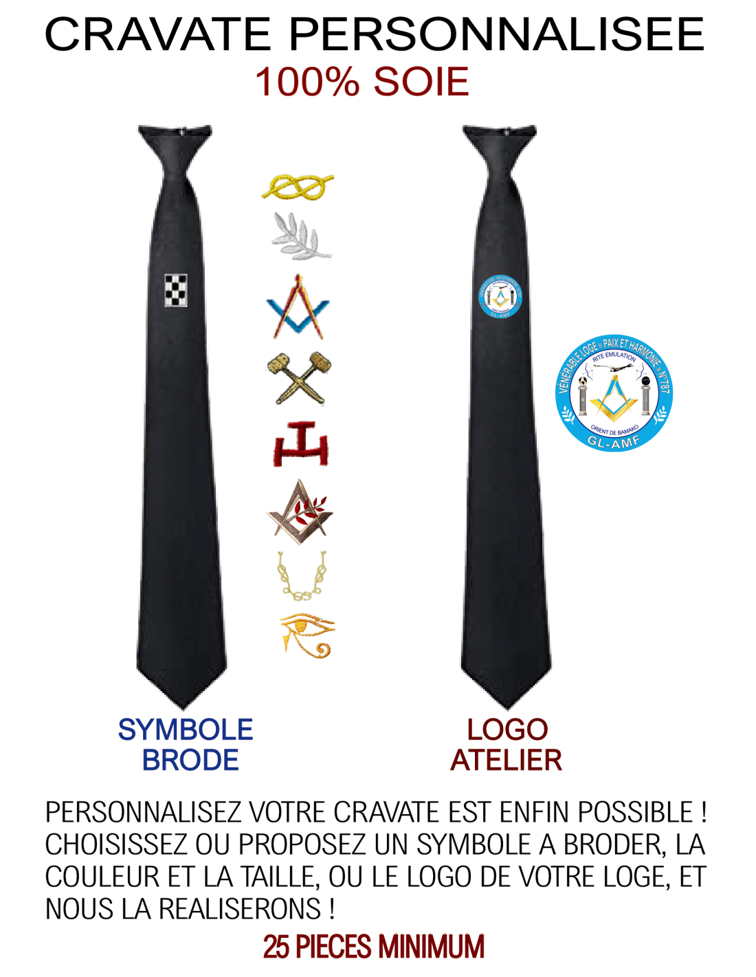 Si vous souhaitez personnaliser davantage les cravates portées par vos frères maçons, optez pour cette cravate soie noire personnalisable. Grâce à la soie, ce modèle de cravate a l’avantage d’être léger et extrêmement doux au toucher.