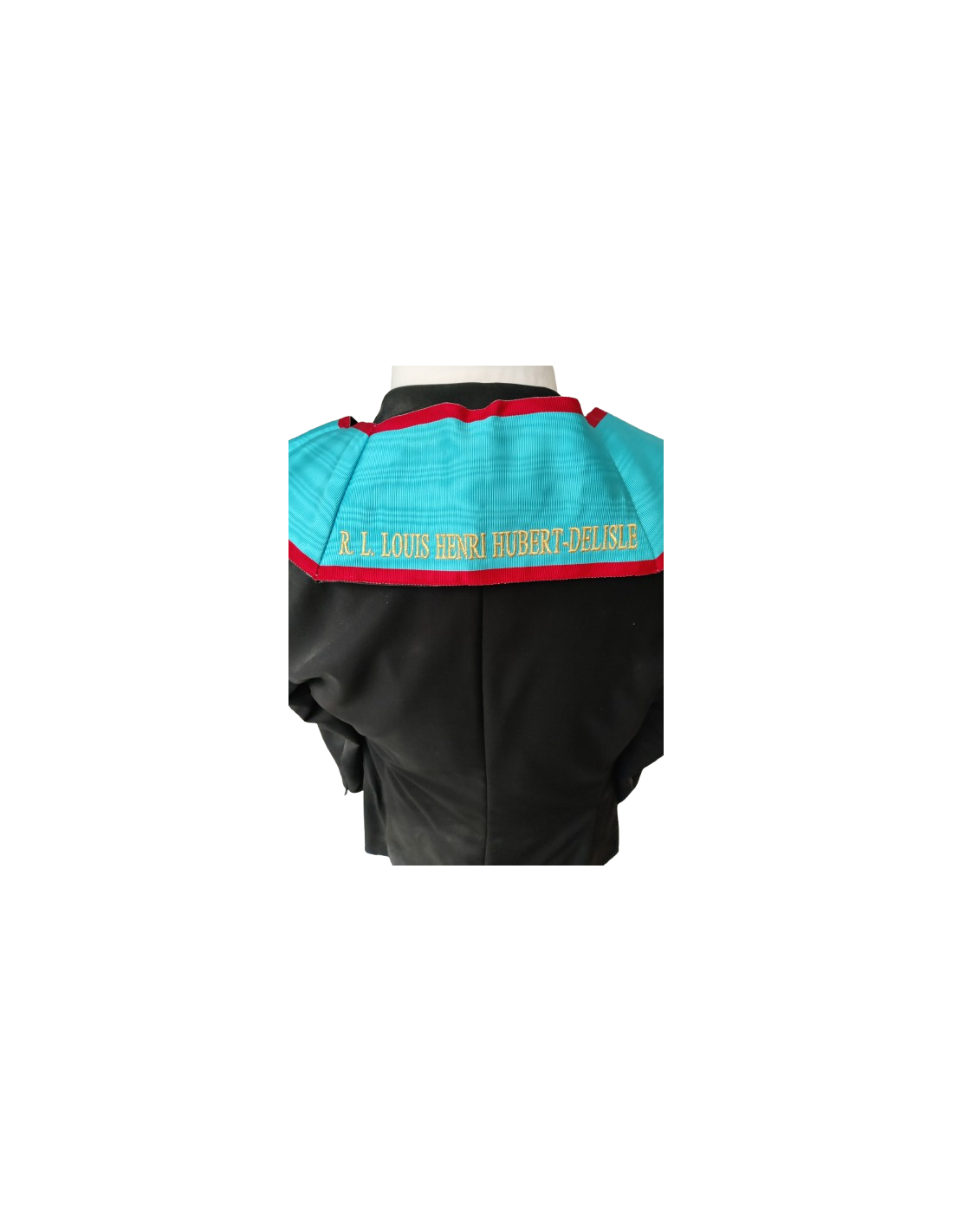 N'oubliez pas de sauvegarder votre personnalisation pour pouvoir l'ajouter au panierSautoir V.M. Collier brodé main. Brodé au nom de la Loge Ruban moiré bleu turquoise avec bordures rouges . Broderie main Gloire Broderie au nom de la Loge Dos noir avec crâne . Os et 9 larmes . Attache pointe pour bijou (lvré sans bijou de V.M.) Exclusivement sur commande Delai 1 mois